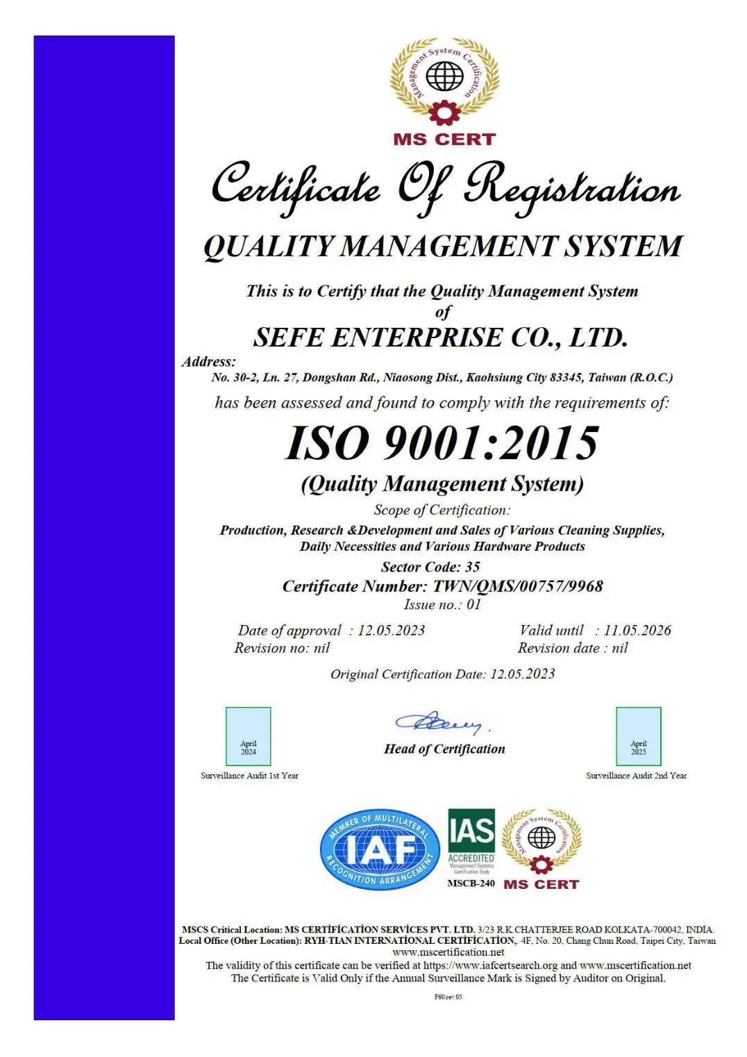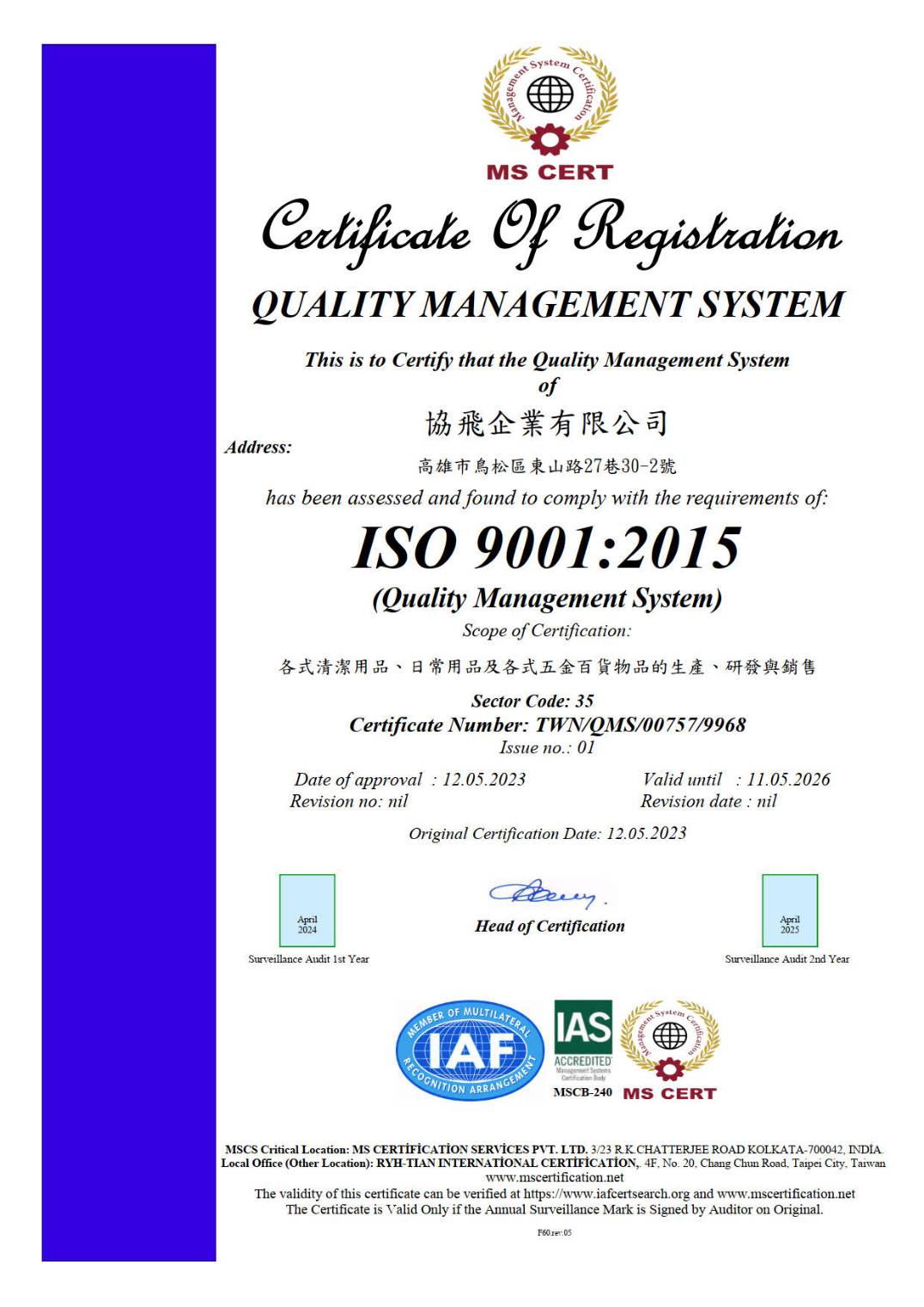 ISO 9001:2015 品質管理系統英文證書